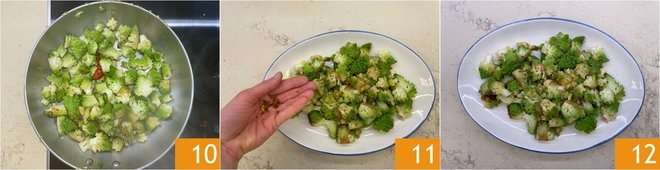 Close the steamer basket and steam for 10 minutes 4. After this time, remove the lid (be very careful of the steam that will escape) and check that the florets have softened 5. In a pan, pour the extra virgin olive oil 6.