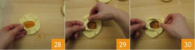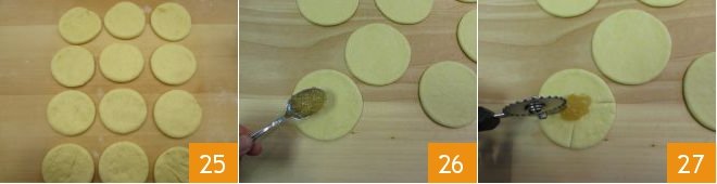 Once you have made your discs 25, take the first one and fill it with a teaspoon of jam, placing it only in the center 26. Consider that you will need to fill 6 with orange marmalade and 6 with apricot jam. At this point, use a pastry wheel to make 4 cuts to create 4 petals of the same size 27.