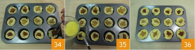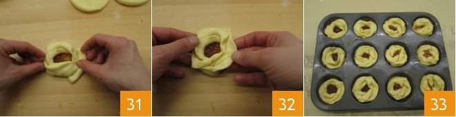 Continue in this way clockwise 31 until you have a little rose 32. Continue this way and gradually place the roses in a pre-buttered muffin tin 33.