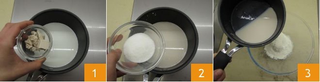 To prepare the rose-shaped brioche rolls, start by warming the milk in a saucepan: it should be lukewarm, not boiling. Add the crumbled yeast 1 and the sugar 2, then stir until everything is dissolved. At this point, pour 150 g of flour into a bowl (taking from the total 300 g) and add the yeast mixture 3.