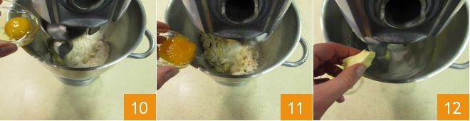 Add the whole egg 10, the yolk 11, and the salt, then work the dough well until it begins to pull away from the sides. Then add a small piece of butter at a time 12,