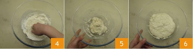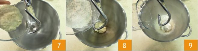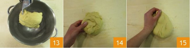 until it is completely absorbed and the dough wraps around the hook 13. Transfer the dough onto a work surface 14, possibly adding a little flour, and knead it until smooth and homogeneous 15.