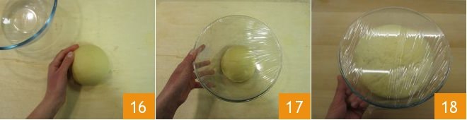 Shape the dough into a sphere 16, transfer it into a bowl, and cover with plastic wrap 17. Let it rise for about 2 hours 18.