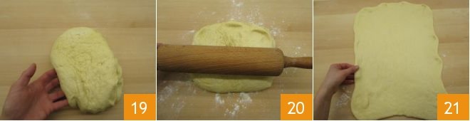 After this time, transfer the dough onto a work surface 19 and, using a little flour, roll it out 20 until it's about 1/4 inch thick 21.