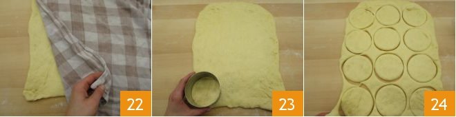 Cover with a towel 22 and let it rest for about ten minutes. Then, using a 4-inch cookie cutter, cut the dough 23 to make 12 discs 24. With the dough scraps, you can make 4 rolls of about 2 1/4 oz each. Let them rest for about twenty minutes and bake them along with the rose-shaped rolls.