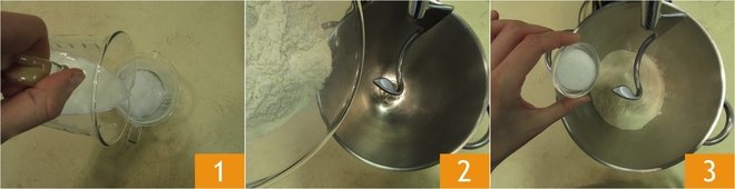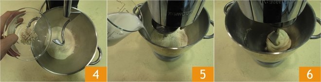 and the crumbled yeast 4. Start kneading at medium-low speed with the hook, adding the liquids little by little 5. Always work at low speed 6.