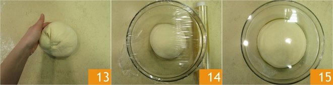 shape it into a smooth ball 13 and transfer it into a previously oiled bowl. Then cover with plastic wrap 14. Let it rise until the dough has doubled in size, about 2 hours 15.