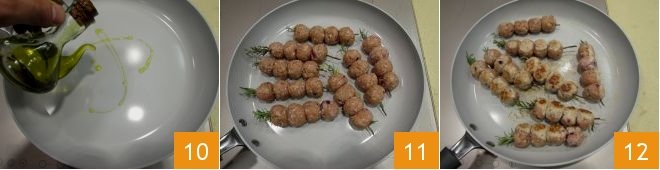 Drizzle a pan with extra virgin olive oil 10, heat it well, and then place the skewers to cook 11. Brown them for 8-10 minutes, turning them on all sides with the help of a flat spatula or kitchen tongs 12. Your rosemary meatball skewers are ready. Serve them immediately!
