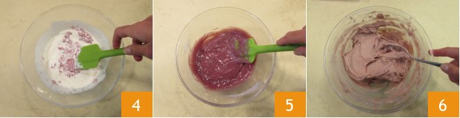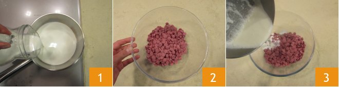 Stir immediately to melt the ruby chocolate 4, and when the ingredients are completely combined, your ruby chocolate ganache is ready to use 5. If you prefer a whipped effect, simply cover the ganache with plastic wrap in contact with the surface and, after at least 2 hours, stir vigorously with a spoon before using 6.