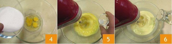 Place the eggs and sugar in a large bowl 4, start working with electric beaters and add the salt 5. When the mixture becomes light and frothy, pour in the seed oil slowly 6.