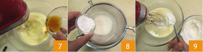 Then also add the flavored rum 7. In a separate bowl, sift the flour with the baking powder 8. Add one tablespoon of the dry ingredients at a time while continuing to beat with the beaters 9.