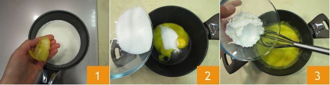 To prepare the rum custard cream, first pour the milk into a saucepan, add the lemon zest 1 and bring it to a boil over low heat, stirring occasionally. Meanwhile, in another saucepan, pour the egg yolks, add the sugar 2, beat with a whisk, and also incorporate the cornstarch 3.