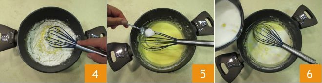 Mix with a whisk 4 until you have obtained a smooth and homogeneous mixture. Add the salt 5, mix again, and as soon as the milk starts to boil, slowly pour it into the egg yolk mixture 6, continuing to stir.