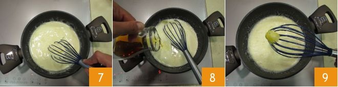 As soon as you have incorporated all the milk, place on the heat 7, add the rum, and mix 8. Then remove the lemon zest 9