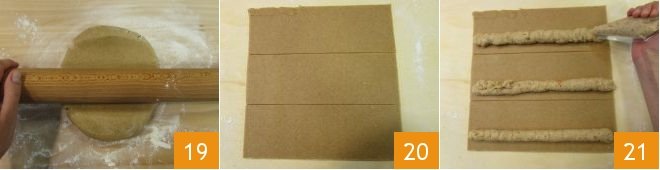 Take the pastry, remove the plastic wrap, lightly dust the work surface, and roll out the dough with a rolling pin 19 to form a 12x12 inch square. Trim the edges to give the correct size, then cut the square into 3 strips 4 inches wide 20. With the piping bag, make a strip of filling along the long side of each pastry strip 21.