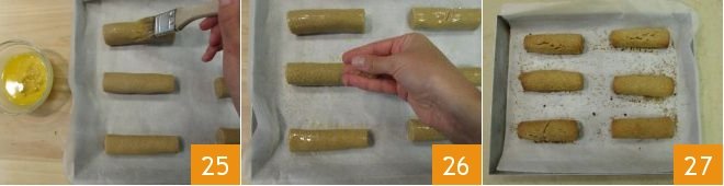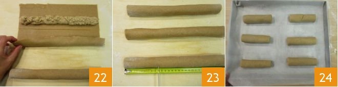 Roll the pastry to cover the filling until completely sealed, forming 3 rolls 22. Let them rest in the refrigerator for 5 minutes. Then cut each roll into 3 pieces 4 inches long each 23 and place them on a baking sheet lined with parchment paper 24.