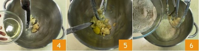 and mix with the paddle attachment of the stand mixer until all the ingredients are blended. Add the egg whites 4, the seeds of half a vanilla pod 5, and mix again for about 1-2 minutes. Finally, add the flour and baking powder 6