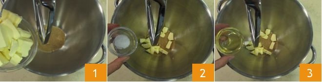 To prepare rustic apple cookies, start with the pastry: in a stand mixer, add the brown sugar and cold butter in pieces 1. Also, add the pinch of salt 2 and the acacia honey 3