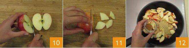 Prepare the filling: wash and cut the apples first in half 10 and then into wedges, then remove the core and seeds and cut them into slices 11. Put the apples in a pan with the sugar and cinnamon 12,