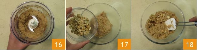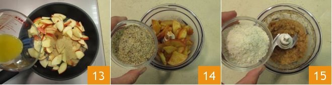also pour in the orange juice 13 and cook with the lid on for about 5 minutes. Once ready, transfer them to a mixer along with the hazelnut flour 14 and almond flour 15