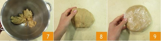 and mix until you get a uniform and compact dough 7. Transfer it to a work surface, compact it, and wrap it in plastic wrap (8-9). Let the dough rest in the refrigerator for at least 30 minutes.