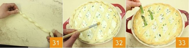 Finally, decorate the edge with a strip of dough the same length as the perimeter of the pan, twisted into a helix shape 31. Brush the surface with a beaten egg 32 and bake again at 350°F for 70 minutes (if fan-assisted, at 320°F for 60 minutes). Once cooked, remove the pie from the oven, garnish it with the asparagus tips 33, and serve it at the table!