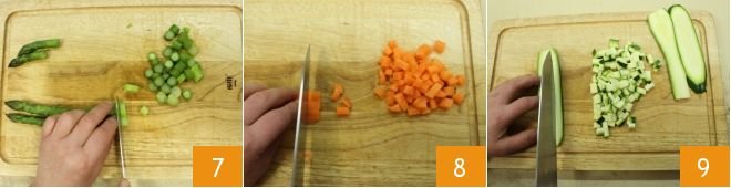 Once they are cooked, cut them into rounds 7 taking care to keep the tips whole (they will be used for garnishing). Wash, peel, and dice the carrots 8 and zucchini 9.