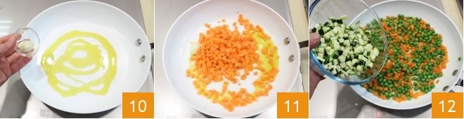 In a large pan, heat a drizzle of olive oil 10, add the diced carrots 11, a whole clove of garlic, the peas, diced zucchini 12 and sauté the vegetables for a few minutes: they should remain crunchy and not fall apart.