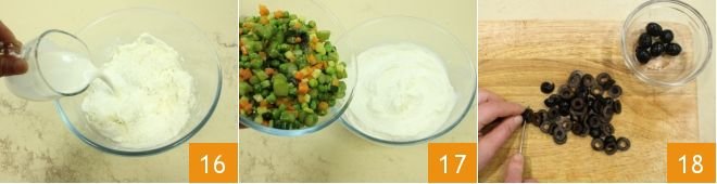 pour the milk 16 and mix the cheese mixture to obtain a smooth and soft cream. At this point, add the sautéed vegetables to the mixture 17, slice the black olives into rounds 18