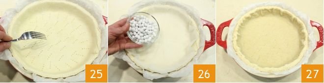 Pierce the bottom of the pastry with a fork 25, so it won't puff up too much during baking. Then cut a parchment paper disc the diameter of the pan, wet it, squeeze it, and place it on the pastry. Cover the base with dried legumes or specific weights for blind baking 26. Bake the shortcrust pastry in a preheated static oven at 350°F for 30 minutes (if fan-assisted, at 320°F for 20 minutes). Remove the pan from the oven 27, take out the weights and parchment paper 27
