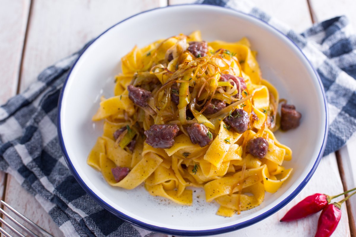 There are ingredients that are good on their own but even tastier when combined and used to create flavorful dishes to share. Sausage, for example, together with leek, can create a first course with a rustic and exquisite taste, like pappardelle with sausage and leeks. A first course with a bold and authentic flavor: the rough and porous pappardelle are perfect for capturing the rich seasoning, while the delicate notes of the leeks embrace the succulent sausage meat... a combination of flavors that can also be proposed as an appetizer, for example with the recipe for Leeks with Ham. Tasty and enveloping, this pasta with sausage is quick to prepare, perfect for unexpected guests or a family dinner. Serve it with a full-bodied red wine and indulge in the pleasure of these pappardelle with sausage and leeks!