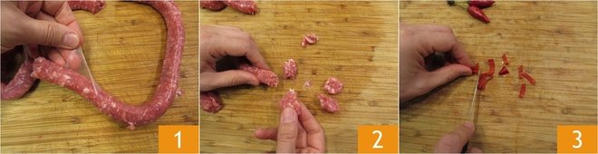 To prepare the rustic pappardelle with sausage and leeks, start with the sausage. Remove the casing 1 and cut it into chunks about 3/4 inch 2. Now, take care of the chili pepper: remove the seeds and cut it into strips 3.