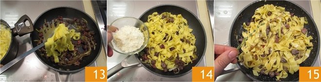 When they are cooked, drain them and transfer them directly to the pan 13. Add the grated Parmesan 14, a ladle of the pasta cooking water, a bit more thyme 15, and toss to mix the pappardelle well with the seasoning. Serve the rustic pappardelle with sausage and leeks, adding a grind of black pepper and some thyme leaves.