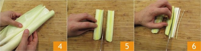 Take the leek and remove the outer leaves 4. Cut it in half 5 and then into thin strips 6.