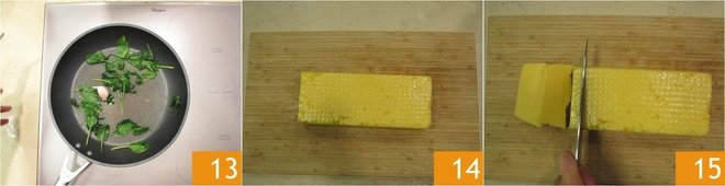 Also cook the spinach for 2-3 minutes, sautéing them with a clove of garlic 13. Turn the polenta out onto a cutting board 14 and cut out 12 slices, each about 3/4 inch thick 15.