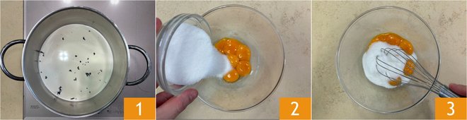 To prepare saffron custard, first, in a saucepan, pour the milk and cream and add the vanilla. Heat to 140°F, or until hot 1. Meanwhile, in a bowl, place the egg yolks and add the sugar 2 and mix with a whisk 3 until you obtain a homogeneous mixture.