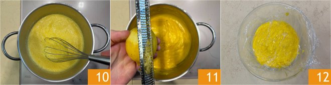 Cook on low heat, stirring continuously 10, for 5-6 minutes, until thickened. Add the grated lemon zest 11, stir vigorously once more to prevent lumps from forming, and transfer everything to a bowl. Cover with plastic wrap in contact 12 and let cool first at room temperature, then place it in the refrigerator. Your saffron custard is ready to use!