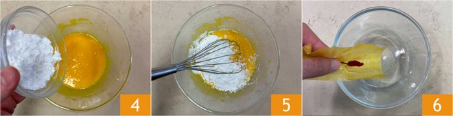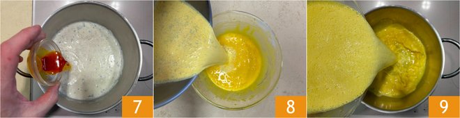 Pour the saffron into the hot milk 7 and stir. At this point, pour the milk into the egg yolk mixture 8. Mix and transfer everything back to the saucepan 9.