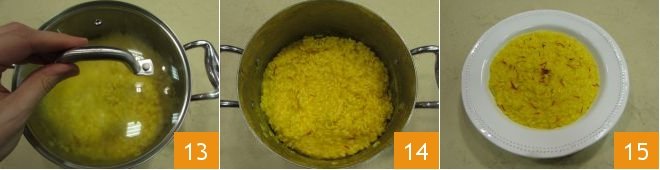 Stir and cover with a lid 13. Let it rest for a couple of minutes. At this point, the saffron risotto is ready 14, garnish the dish with a few more saffron threads, and serve the risotto hot 15.