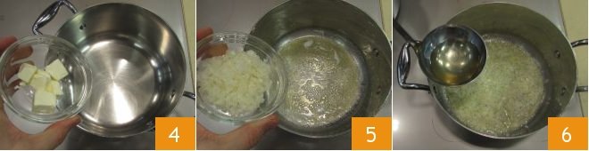 In a large saucepan pour 1/4 cup (50 g) of butter from the total amount for this recipe 4, melt it over low heat, then add the chopped onion 5 and let it stew for 10-15 minutes, adding some broth to avoid drying the sauté 6: the onion must be transparent and soft.