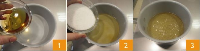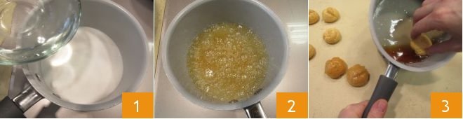 Now, focus on filling and glazing your Choux pastry (pâte à choux). First, make the caramel: put the water and sugar 1 in a saucepan, let it boil until the syrup transforms into a Caramel 2. Quickly dip one cream puff at a time into the freshly made caramel 3 (be very careful not to touch the caramel, as it will be hot).