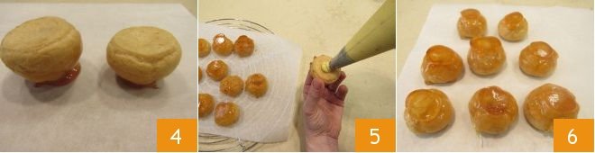 Let the excess caramel drain back into the pan, then place the cream puff upside down on a sheet of parchment paper 4, making sure the flat side is parallel to the sheet and not tilted. Let the caramel cool and harden, then turn them over on the base; you will notice a charming and characteristic decoration on the cream puff, as if a caramel disk is placed on top. Pierce the cream puffs at the base, fill them with the leftover custard using a piping bag 5, and store in the refrigerator 6.
