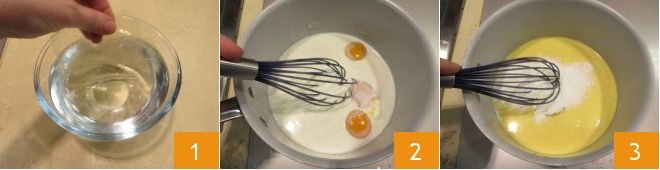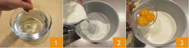 Also prepare the Pastry cream. Soak the gelatin sheets in a bowl full of cold water 1 and let them soften for 10 minutes. Pour the cream, milk 2, and yolks 3 into a saucepan.