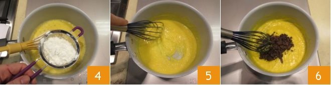 Then mix with a whisk, also adding the sifted cornstarch 4. Turn on the heat and thicken while stirring 5, then remove the saucepan from the heat and add the chopped chocolate 6.