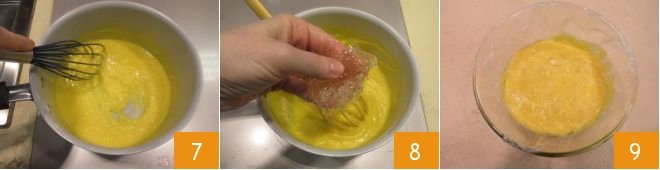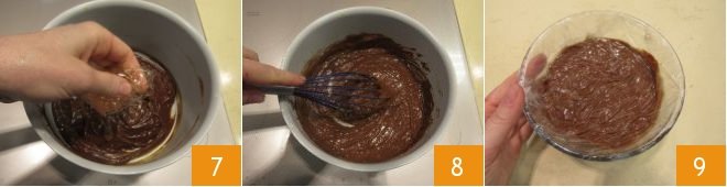 Mix again until the chocolate is completely melted and finally add the gelatin 7, which you have removed from the water and squeezed well; let it dissolve completely while stirring 8. The chocolate custard is ready. Place it in a bowl, covered with cling film 9, and let it cool in another bowl with ice and water to cool it down quickly; then transfer it to the refrigerator.