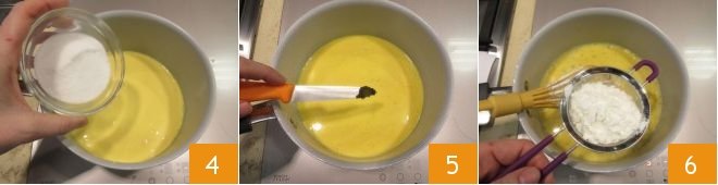 Mix with a whisk and add the sugar 4, the seeds from a vanilla bean 5 (first cut it in half and then scrape the seeds with the blade of a thin, sharp knife), and the sifted cornstarch 6.