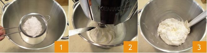 Lastly, focus on the final decoration. Make the Chantilly cream: in the bowl of a stand mixer with whisks, pour the cold fridge cream, icing sugar 1, and the seeds from a vanilla bean 2, then whip at medium speed 3.