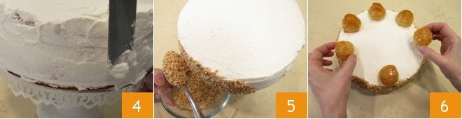 Using a spatula, completely cover the cake with chantilly cream 4 and transfer the remaining into a piping bag fitted with a large star nozzle. Cover the edges of the cake with hazelnut crumbs using a spoon 5 (alternatively, you can also use sponge cake or puff pastry crumbs). Place the cream puffs on the edges of the cake, spacing them evenly, and leaving a space between one cream puff and another 6.