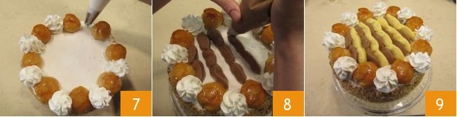At this point, make a tuft of chantilly cream between each cream puff with the piping bag 7. Place the chocolate custard in a piping bag with a teardrop nozzle (typical for decorating Saint-Honoré cake) and create rows of cream quenelles 8, leaving space between each row. Insert other rows of quenelles, this time made of classic custard, using the same piping bag with a teardrop nozzle 9. Place the Saint Honoré cake with sponge cake in the refrigerator for at least one hour before serving.