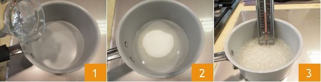 Once your creams are well chilled, start preparing the Italian Meringue. Pour the water 1 and 140 grams of sugar 2 into a saucepan and cook until it reaches 250°F (use a kitchen thermometer to measure the exact temperature) 3.